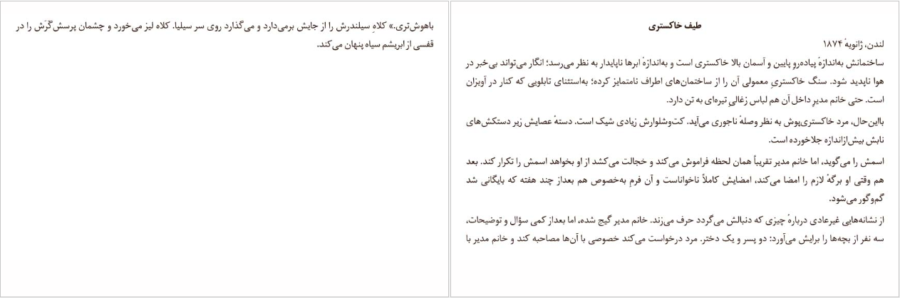 امشب آخرین اجرای یک برنامه‌ی خیلی محدود است. پِراُسْپِروی افسونگر مدتی است لندن را مستفیض نکرده و رزروها فقط برای یک هفته از اجراهاست، بدون اجرا درطولِ روز. بلیت‌ها، بااین‌که قیمت سرسام‌آوری برایشان تعیین شده، به‌سرعت فروش رفتند و تئاتر پُرِ پر شده؛ خیلی از زنان بادبزن‌هایشان را در دست نگه‌ داشته‌اند تا دکلته‌شان را باد بزنند و گرمای سنگینی را که به‌رغم خنکای پاییزیِ بیرون فضا را پر کرده پس برانند. در زمان خاصی درطولِ شب، هرکدام از آن بادبزن‌ها ناگهان پرنده‌ای کوچک می‌شود، تا جایی که دسته‌هایی از آن‌ بادبزن‌ها در سالن تئاتر، درمیانِ تشویقی پرغوغا، حلقه می‌زنند. وقتی هریک از پرنده‌ها برمی‌گردد و دوباره به‌شکل بادبزنی جمع‌شده روی پای صاحبش می‌افتد، تشویق فقط بیشتر می‌شود، بااین‌که بعضی‌ها آن‌قدر متحیرند که نمی‌توانند دست بزنند. این‌ها بادبزن‌های توری و پَردار را شگفت‌زده در دستانشان جابه‌جا می‌کنند و دیگر اصلاً متوجه گرما نیستند. مردی که کت خاکستری به تن دارد و در جایگاه سمت چپ صحنه نشسته تشویق نمی‌کند؛ نه برای این، نه برای هیچ شعبده‌ی دیگری درطولِ شب. مردِ روی سکو را با نگاه خیره‌ی مداوم و موشکافانه‌ای تماشا می‌کند که هیچ‌وقت در تمام طول اجرا تغییری نمی‌کند. او حتی یک بار هم دستان دستکش‌پوشش را برای کف‌زدن بلند نمی‌کند. با دیدن کارهایی که باعث می‌شود تماشاچی‌های مسحور دست بزنند یا نفس‌ در سینه حبس کنند یا گاهی جیغی از سر غافل‌گیری بکشند حتی ابرویش را هم بالا نمی‌دهد. بعد از این که اجرا خاتمه می‌یابد، مرد کت‌خاکستری به‌راحتی راهش را ازمیانِ ازدحام جمعیت در لابیِ سالن باز می‌کند. از دری پرده‌دار عبور می‌کند و بدون آن‌که ببینندش به اتاق گریم می‌رود.